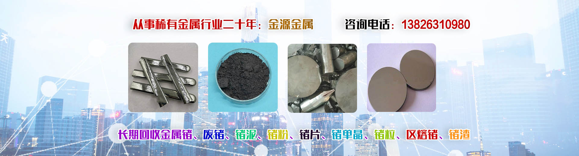 韶關市金源金屬材料有限公司坐落于中國廣東省韶關市,長期收購回收銦、精銦、粗銦、銦絲、銦靶材、ITO靶材靶粉、回收金屬鍺、鍺錠、鍺粉、鍺片、回收鍺單晶、單晶鍺、鍺粒、區熔鍺、工業鍺、廢鍺、鍺泥、鍺渣、二氧化鍺回收、四氯化鍺、有機鍺、銀、純銀、銀靶材、高價收購回收ITO廢靶、回收廢銦、廢銦沙、廢銦渣、回收粗銦、廢銦絲、廢銦珠、廢銦箔、廢銦棒、收購銀焊條、銀焊絲、導電銀膠、金屬鎵、硝酸鎵、氧化鎵、三氯化鎵、氯化鎵,供應及回收氧化鎵、氫氧化鎵、碲化鎵,硒化鎵,銦粉,氧化銦、氯化銦、硫酸銦、硫化銦、醋酸銦、氫氧化銦、硒化銦,碘化銦,銅銦鎵硒,含金、銀、銦、銠、鈀、鎵、鍺等稀有貴金屬材料,稀土金屬材料、氧化鏑、氧化镥、氧化鋱、氧化鐠釹等回收。
